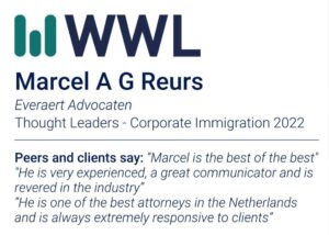 Marcel wordt ieder jaar door internationale collega’s aanbevolen in Who is who in corporate immigration (WWL: Corporate Immigration) Sinds 2018 wordt hij in deze uitgave aangemerkt als een van de tien meest toonaangevende arbeidsmigratieadvocaten van Europa.